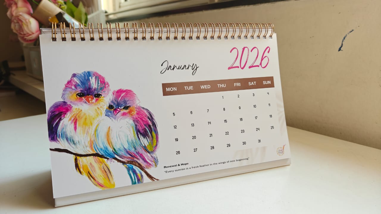 A beautifully designed 2026 desk calendar featuring hand-painted birds. Perfect for home, office and gifting. Premium print, vibrant artwork, and sturdy spiral stand.