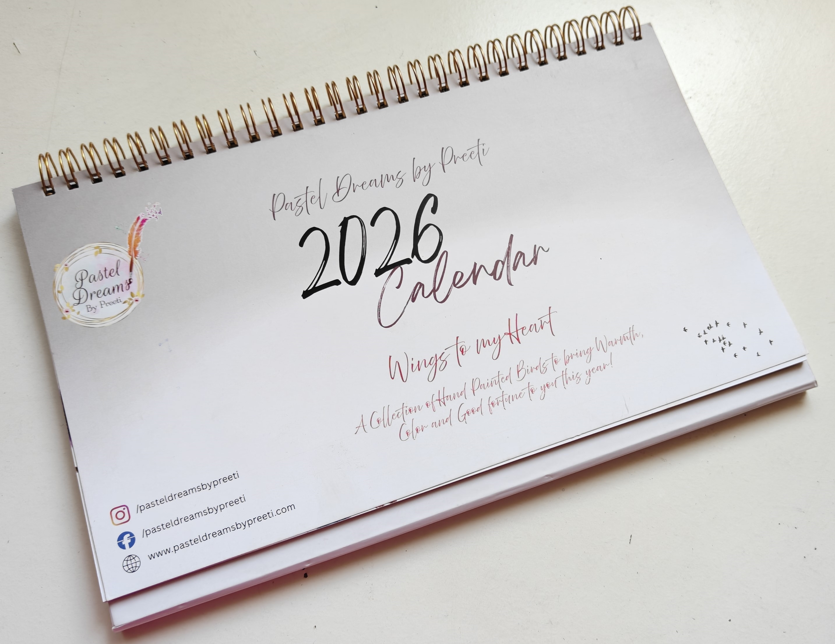 A beautifully designed 2026 desk calendar featuring hand-painted birds. Perfect for home, office and gifting. Premium print, vibrant artwork, and sturdy spiral stand. 10% off on Bulk ordering